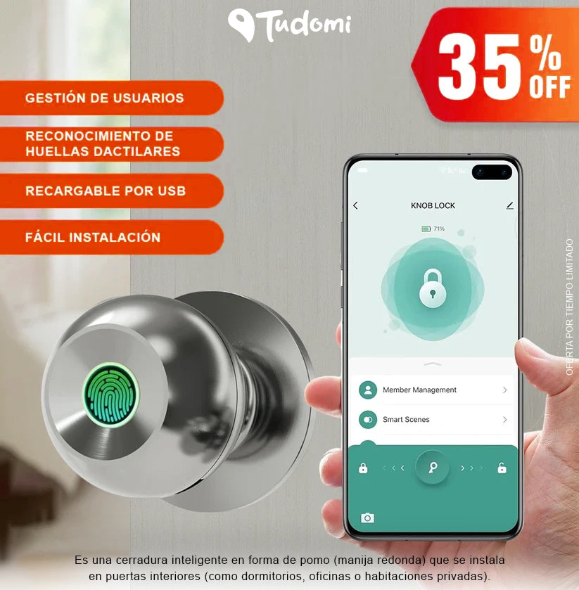 Además de ofrecerte seguridad biométrica de alta tecnología, este pomo inteligente se instala fácilmente como cualquier otro. Su diseño moderno combina con cualquier puerta, y su batería recargable asegura meses de uso sin preocuparte por reemplazos.