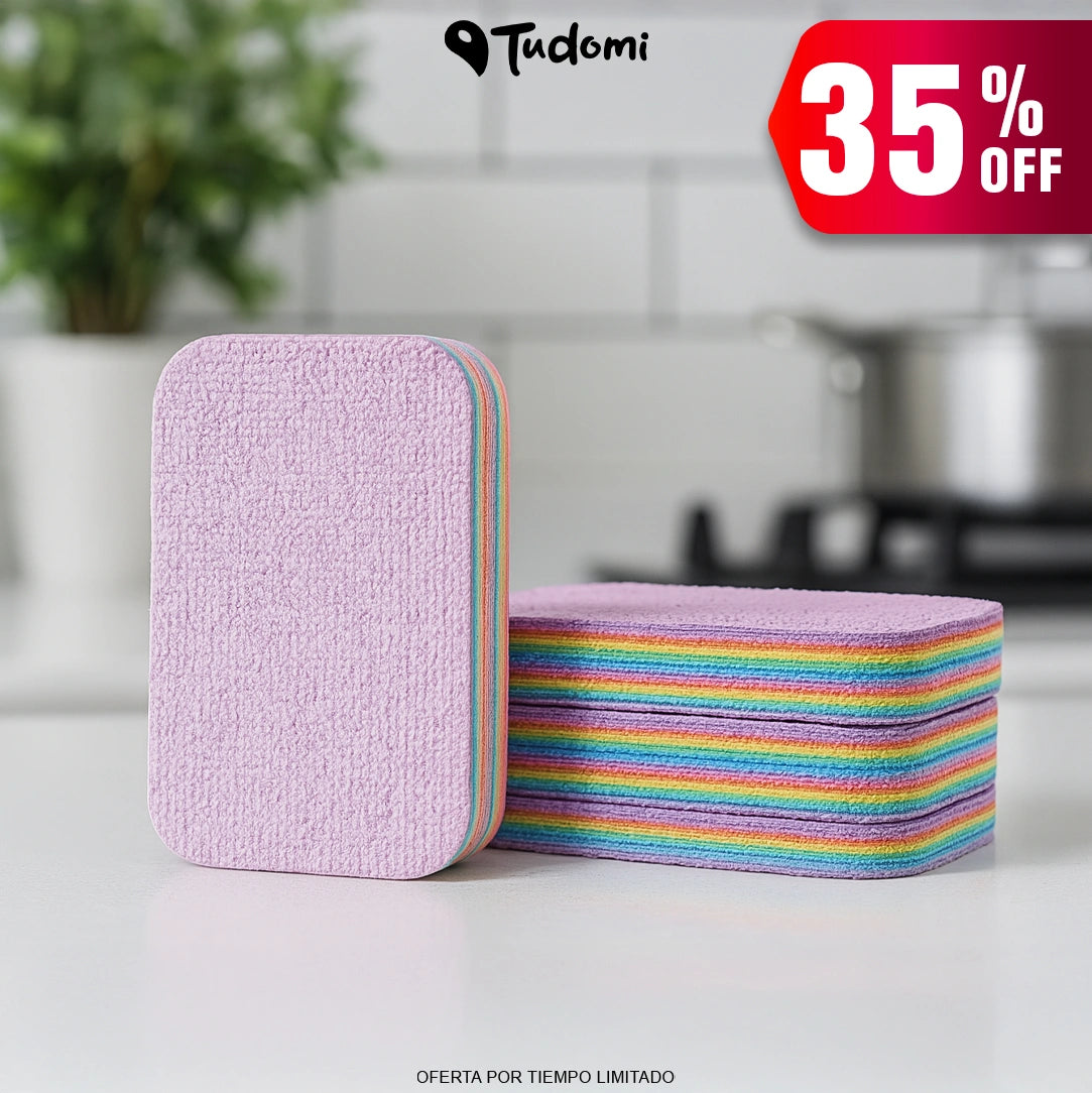 Esta esponja multicapa ultra absorbente es como tener 5 esponjas en 1, cuando una capa se desgasta, la retiras y listo: es como nueva otra vez, sin olores, sin desperdicio, sin gastar de más.