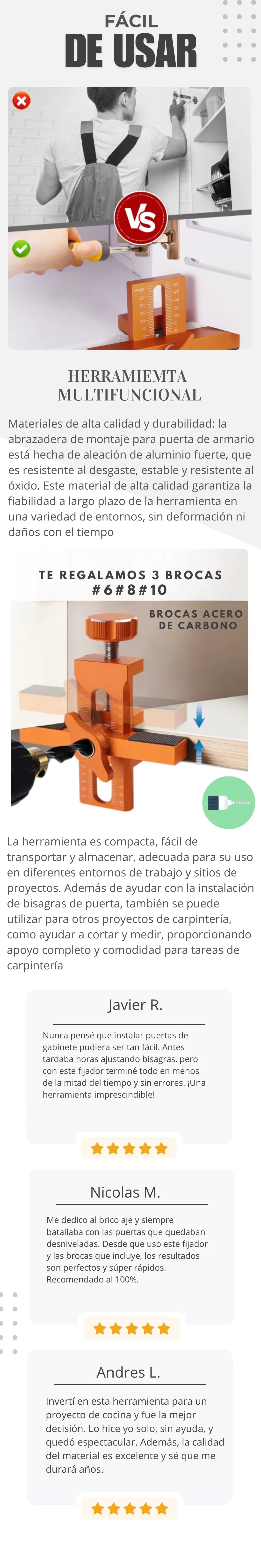Sí, es perfecto tanto para profesionales como para aficionados al bricolaje. Su sistema de posicionamiento preciso facilita la instalación aunque sea tu primera vez trabajando con bisagras.