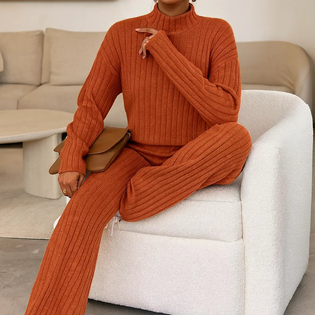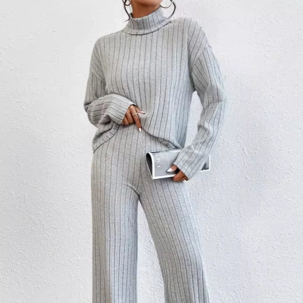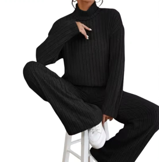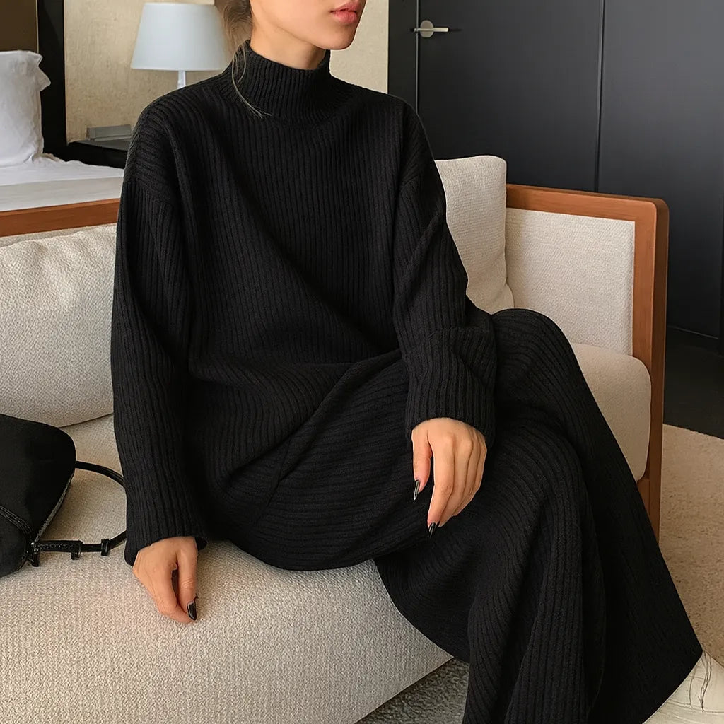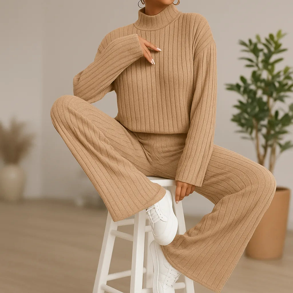 Suéter de cuello alto y pantalón de pierna ancha que estiliza la figura. |